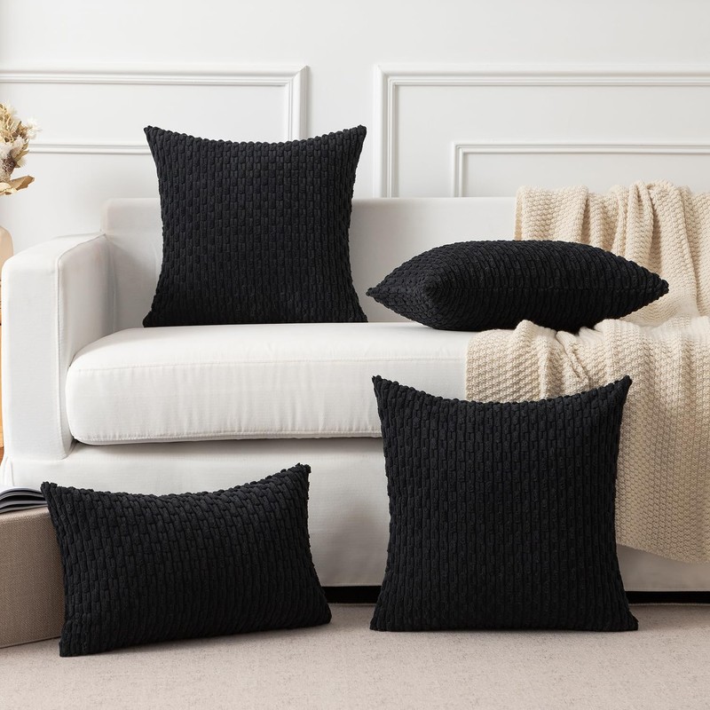 Kevin Textile Set of 2 Decorative Pillow Cover Solid Striped Corduroy Plush Velvet Cushion Cover for Couch 50cm 20 x 20 Inch Black