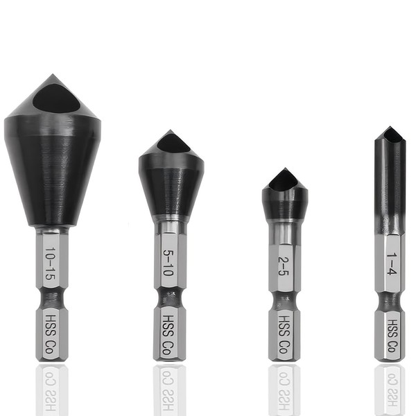 KEWAYO 4 Piece Countersink Deburring Countersink 90° Chamfer Titanium Coated Countersink Drill Bit Set, Cross Hole Countersink HSS-Co (Cobalt) for Wood, Metal, Plastic