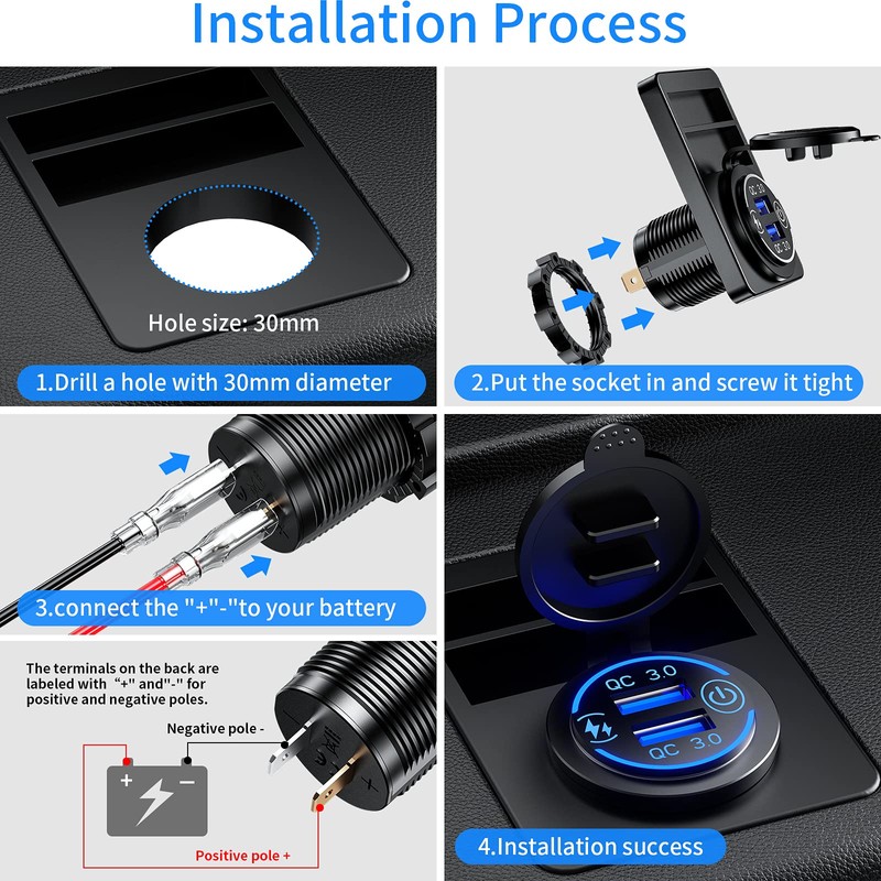 - Interruptor táctil y LED azul: la toma USB de 12 V está equipada con un interruptor de control de alimentación. Apaga el interruptor cuando la toma USB no esté en uso, lo que puede ahorrar energía de la batería del vehículo. La luz LED azul puede ayudarte a comprobar si el circuito está conectado correctamente y encontrar fácilmente el puerto de carga USB en el entorno oscuro.