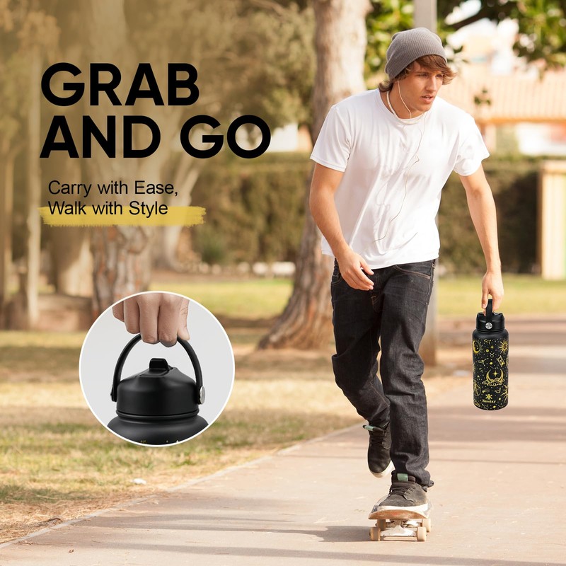 - Sweat-Free and Portable Design: Enjoy a dry grip with our non-sweat surface, preventing condensation from dampening your bag. The ergonomic carry handle makes this stainless steel water bottle ideal for on-the-go use, whether you're at the gym, hiking, or simply commuting.