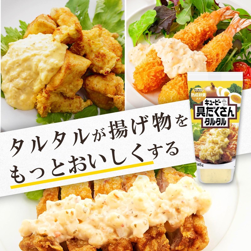 - Ingredients: Vegetable oil (made in Japan), egg white processed product (egg white, oiled processed), reduced sugar syrup, brewed vinegar, salt), chicken egg, sugar, brewed vinegar, dried onions, salt, lacto fermented egg white, chicken egg processing products, egg protein white hydrolyze, pickles, garlic paste, milk protein, concentrated lemon juice, spice/glue (processed seasoning age) Seasoning (amino acids) ), Sweetener (Stevia), Spice Extract, Acidulant, (some may contain eggs, dairy ingredients, and soy)