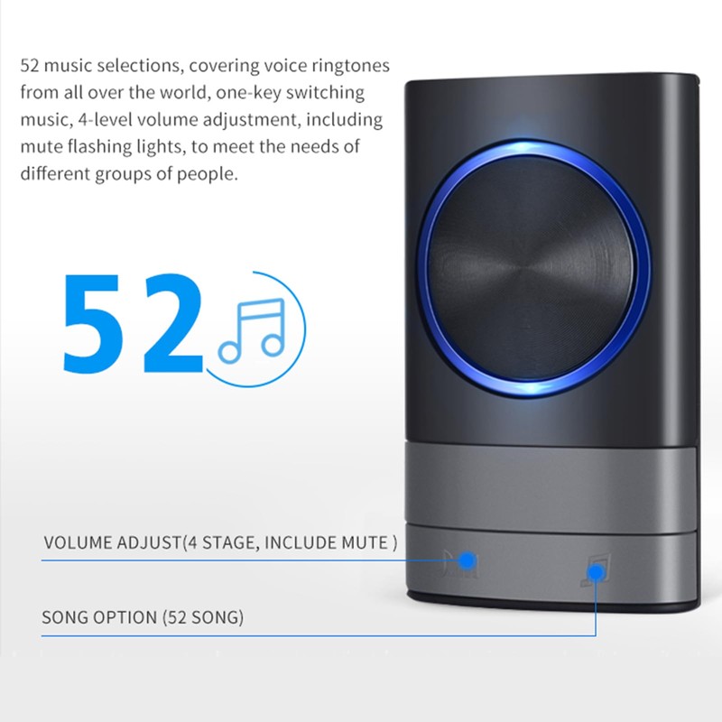 - 52 Titel, 4 Lautst?rkestufen: Diese drahtlose Trklingel verfgt ber 52 melodische Klingelt?ne aus aller Welt, die per Knopfdruck umgeschaltet werden k?nnen. Dieses Produkt hat vier Stufen der Lautst?rke einstellbar (einschlie?lich Stummschaltmodus), und hat auch einen blauen Blitz, Stummschaltmodus Blitz leuchtet immer noch, um Ihre verschiedenen Bedrfnisse zu erfllen.