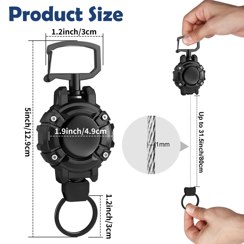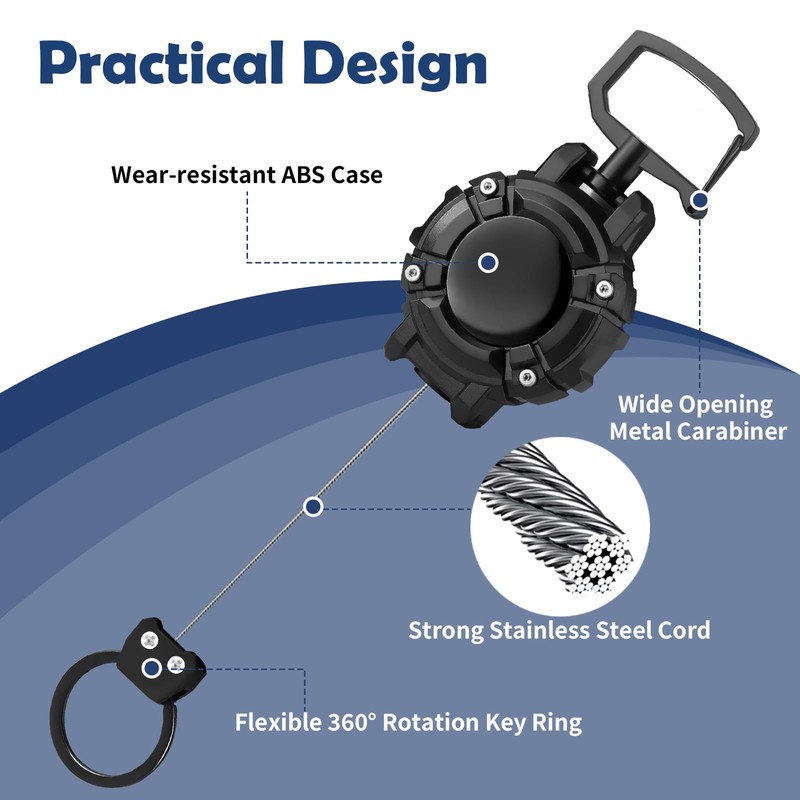 - DURABLE RETRACTABLE DESIGN 80cm long steel wire rope allows free rolling up and bouncing back smoothly. The 360° rotating pull ring prevents tangling, while the widened buckle ensures a secure attachment to prevent accidental loss