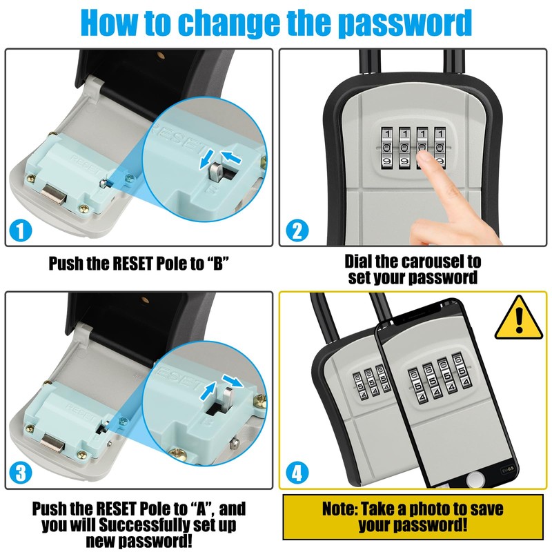 - 【More Security】4-digit combination lock box, provides 10000 combinations. It's easy to reset the desired combination at any time. High security and strong anti-theft. The original password is 0000. Each lock box for keys with code comes with clear instructions on the packaging bag. Please note that once the password is reset, it is best to take a photo to record or it will have no way to open again.