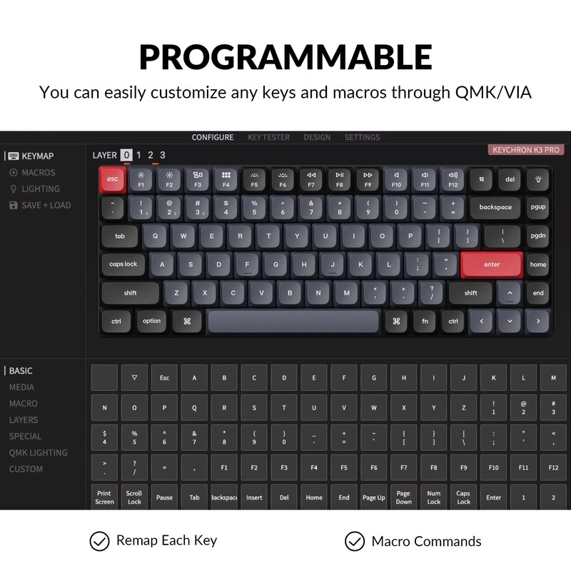 • With QMK and VIA Support: Keychron K3 Pro allows anyone to remap any key, and create macro commands, shortcuts, or combination keys through VIA. Simply connect the K3 Pro to your device with a cable, drag and drop your favorite keys or macro commands to remap any key you want on any system (macOS, Windows, or Linux).