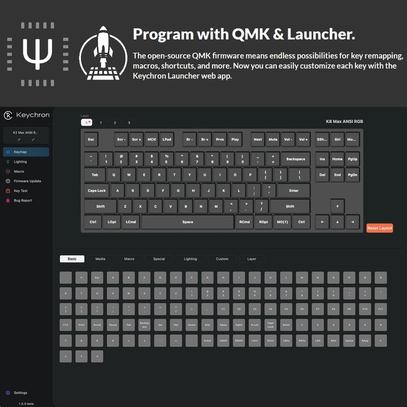 • Program with QMK & Launcher - The open-source QMK firmware means endless possibilities for key remapping, macros, shortcuts, and more. Now you can easily customize each key with the Keychron Launcher web app. N-Key Rollover (NKRO) for both wireless and wired modes.