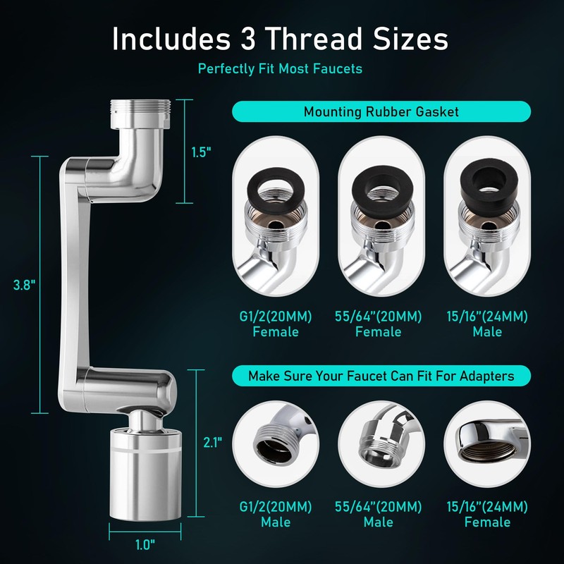 - Compatible with Most Faucet Types: This Faucet Extender Features Three Thread Connection Types: M20/FM20, M22/FM22, and M24/FM24. We Provide Accessories to Assist with Installation. The Sizes G1/2 (20mm), 55/64'' (22mm), and 15/16'' (24mm) Are Designed to Fit Nearly Any Faucet in Your Home, Whether It's for a Bathtub, Kitchen Sink, or Laundry Room. This Makes It a Versatile Choice for Most Households.