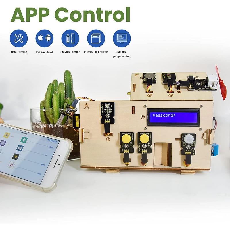 - Multi-function : The smart home includes the functions of Lights and People Photocell Sensor/Human Infrared Sensor/LED Module/Soil dry Reminder Soil Humidity Sensor/Gas leak Alert/Steam Sensor/BT remote App Control etc.Turn The idea Into A Practical Application!