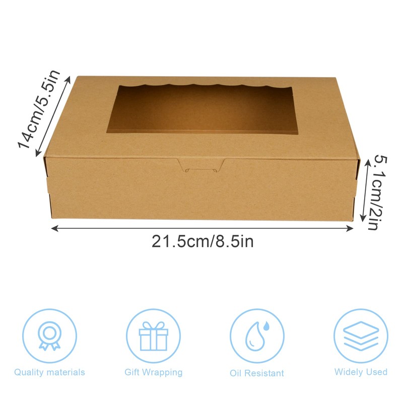 - EMPTY CANDY BOX WITH WINDOW DESIGN: Each bakery box has a transparent window at the top to perfectly display the dessert inside, the rectangular cake box measures 8.5 x 5.5 x 2 inches / 21.5 x 14 x 5.1 cm