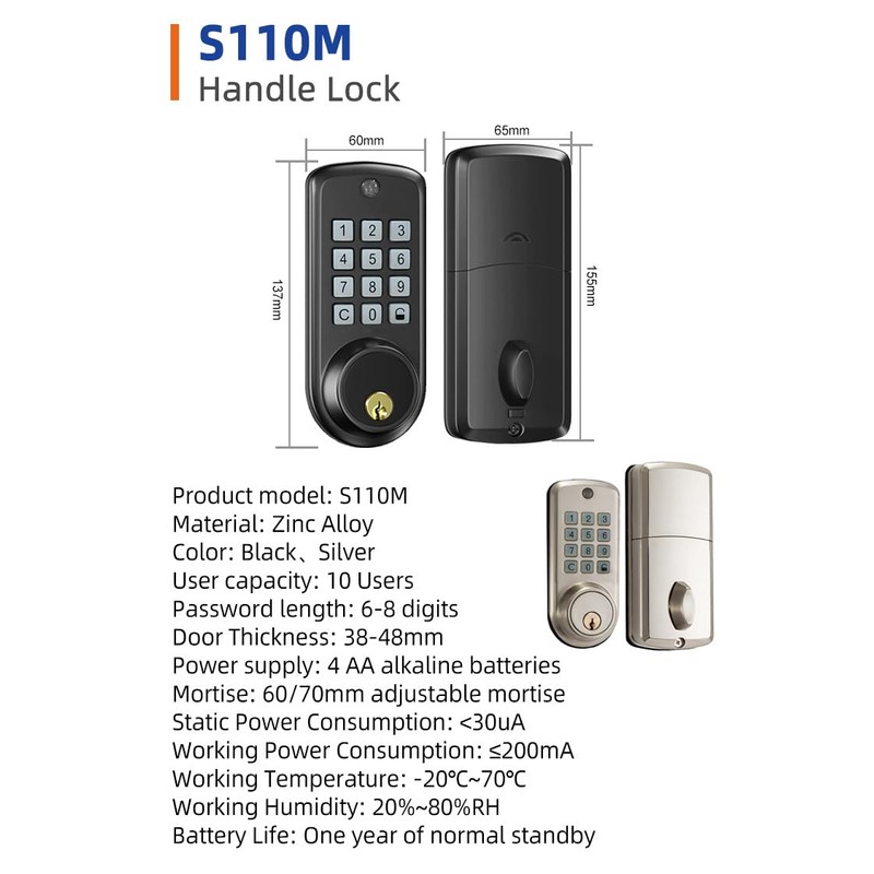- 【The front door lock】Keyless entry door lock: password or mechanical key. The keypad deadbolt works with most standard residential wood doors (1.49 IN/38MM to 1.89 IN/48mm). The front panel of is zinc alloy, the back panel is ABS plastic, the door lock with backlit keypad is perfect for bedroom, apartments, hotels, garage.