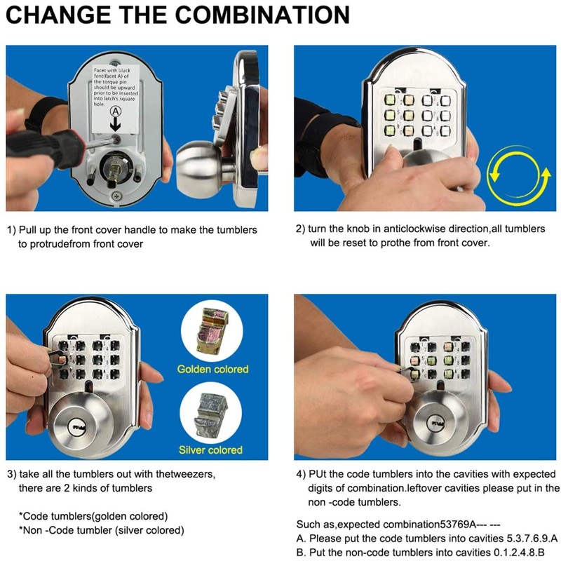 - Design for DIY installation: Combination can be 4-8 digits (no repeats) with tumblers providing over 8,000 options. Please be noted that the combination code can be used in any order.