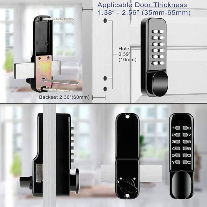 - ใApplicable Doorsใ: This keyless entry door lock is suitable for thickness of the door 1.38" to 2.56" (35mm-65mm), such as fence gate, front gate, side alley/yard gate, screen doors. The center distance of the latch is standard 2-3/8"(60mm). The mechanical Push Button door lock with knob can be manually locked whether indoors or outdoors.