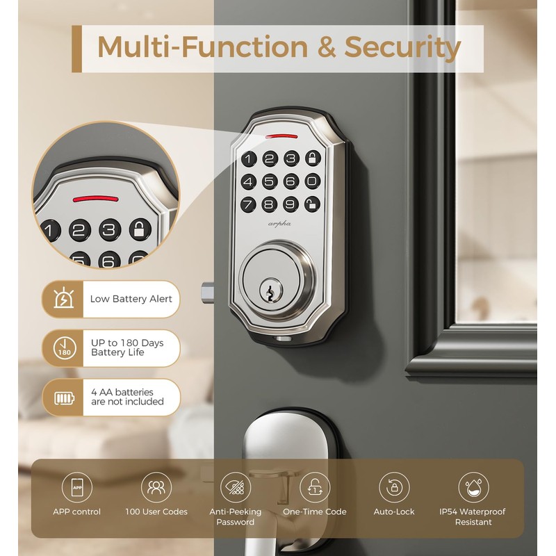 - 𝐊𝐞𝐲𝐥𝐞𝐬𝐬 𝐄𝐧𝐭𝐫𝐲 𝐃𝐨𝐨𝐫 𝐋𝐨𝐜𝐤: Arpha keypad door lock could be unlocked via App + Password + EKey + Mechanical key. Smart deadbolt supports 100 groups of access codes for the front door, including 97 users and 3 admin passcodes. Everything you need in 1 safe and secure smart lock.