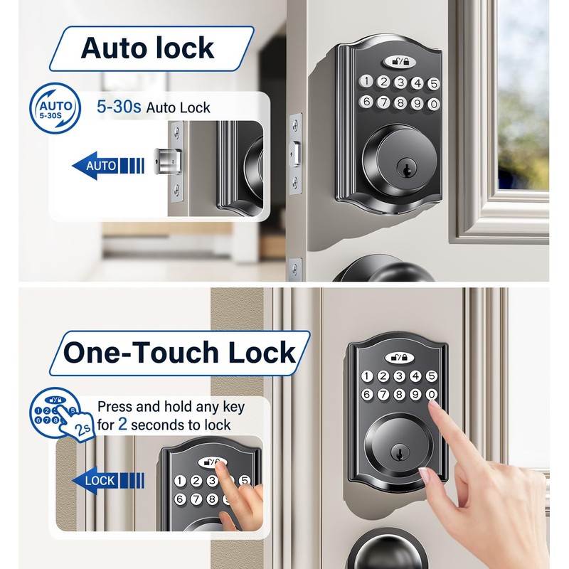 - Auto-Lock & One-Touch Locking: The electronic keypad lock supports automatic locking 5-30 seconds after the door closes. For instant locking, press and hold the top lock button for 2 seconds from the outside, enabling quick and secure operation.