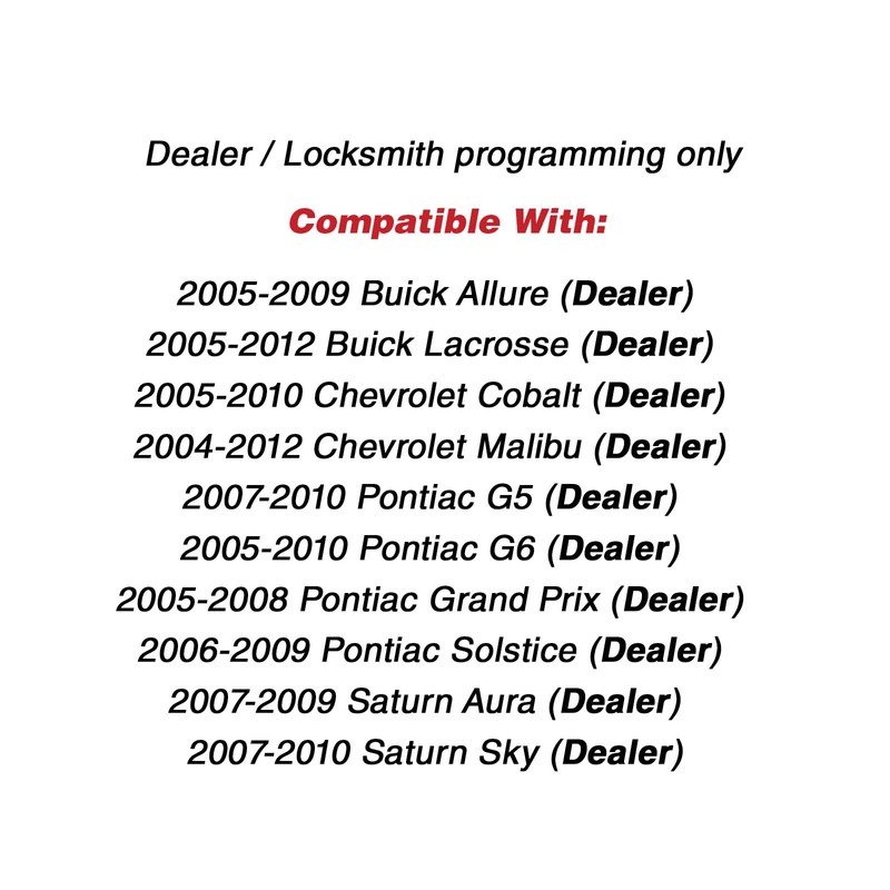 Una manera rápida, fácil y asequible de reemplazar un llavero remoto de entrada sin llave. Control remoto completo con una nueva batería y electrónica instalada. Utiliza el buscador de piezas para asegurarte de que este control remoto es compatible con tu vehículo. Compara visualmente esta pieza y número de pieza con el mando a distancia original del vehículo. El control remoto llegará listo para programar a tu vehículo por un concesionario o un cerrajero automotriz.