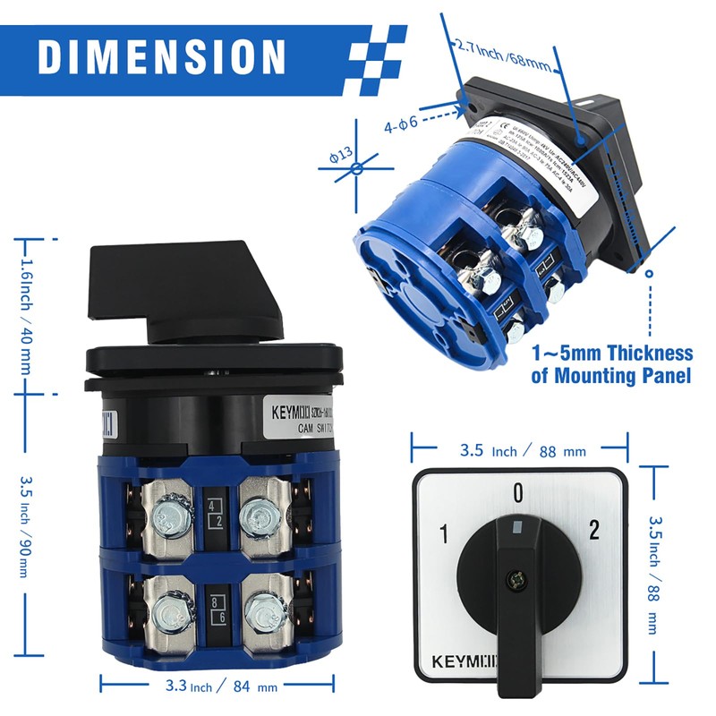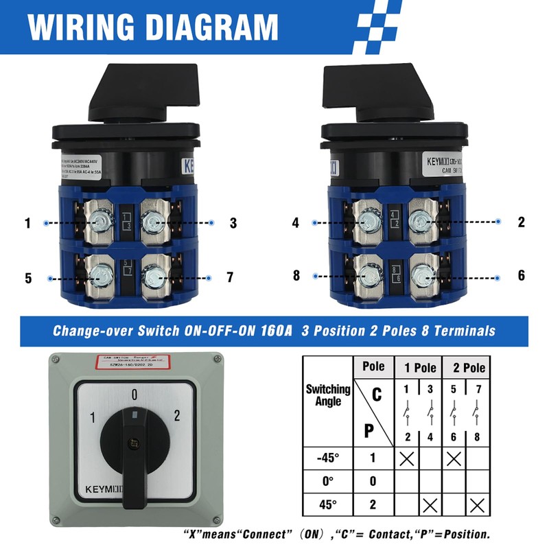 - 【3 Positions】1-0-2 = ON-OFF-ON, 2 Poles, 8 Terminals