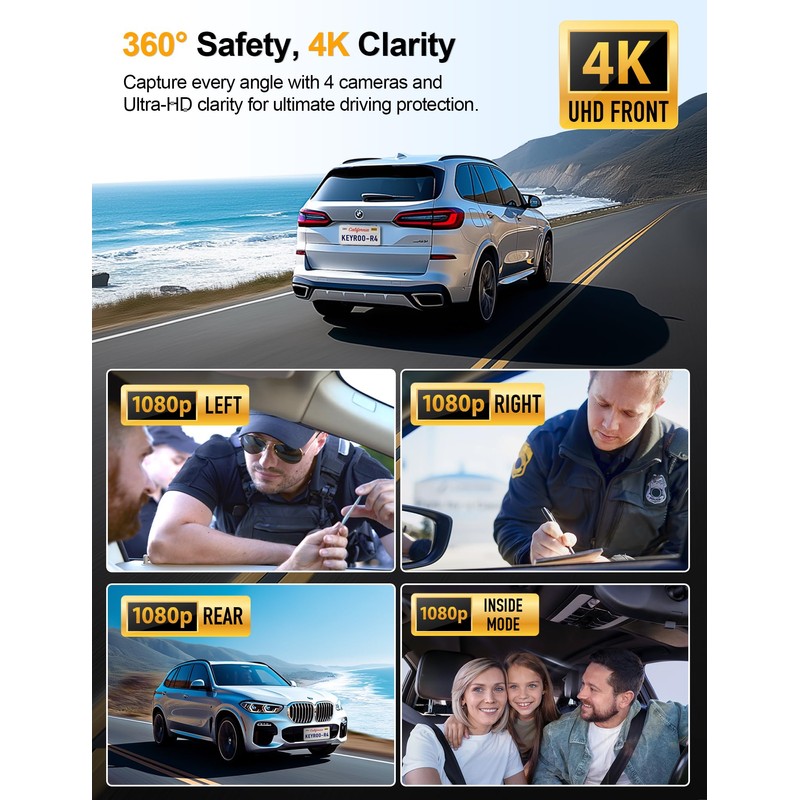 - [Industry-Leading 4K Resolution] The R4 4-Channel Dash Cam is equipped with a top-notch processor and advanced sensors, delivering stunning UHD 4K resolution for the front camera, along with 1080P for the rear, left, and right cameras. Compared to other dash cams that only offer 1080P across all 4 cameras, the R4 car camera ensures sharp video clarity, providing full 360-degree protection. With this design, the blind spots are greatly minimized, offering security and peace of mind on the road.