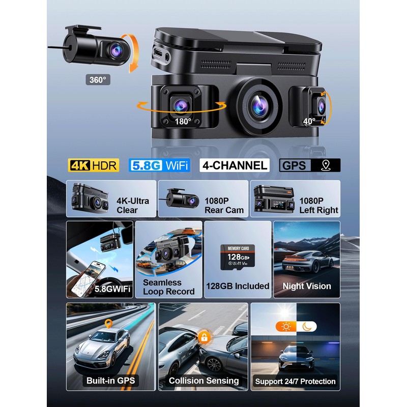 KEYROO 360° View 4 Channel Dash Cam, 4K Front and Rear Inside Left Right, Built-in GPS & 5.8G WiFi App Control, Dash Camera for Cars, 24/7 Parking Mode, G-Sensor, IR Night Vision, Free 128GB Card