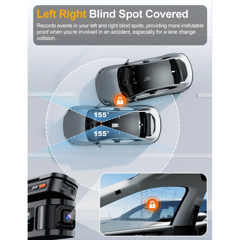 - [Automatic Left & Right IR Mode & Enhanced Night Vision] The R4 Dash Cam’s left & right camera is equipped with an f/1.6 aperture, 4 infrared LEDs, and WDR (Wide Dynamic Range) technology, delivering exceptional night vision on both front and rear left and right sides of the vehicle. Even in low-light or nighttime conditions, this advanced setup ensures clear, high-quality footage for added security.
