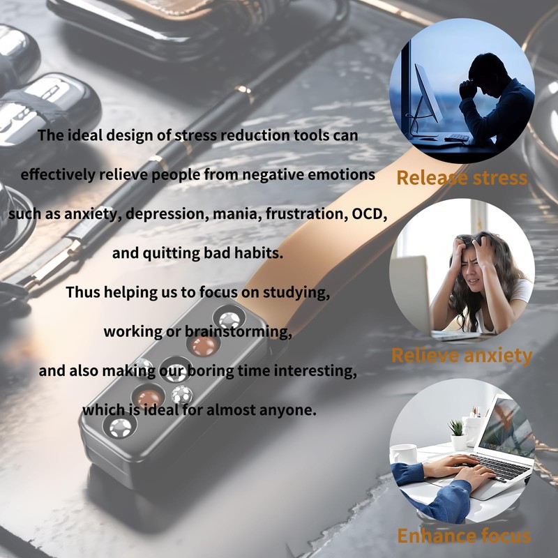 - 4.Stress Rlief:The ideal design of stress reduction tools can effectively relieve people from negative emotions such as anxiety, depression, mania, frustration, OCD, and quitting bad habits. Thus helping us to focus on studying, working or brainstorming, and also making our boring time interesting, which is ideal for almost anyone.