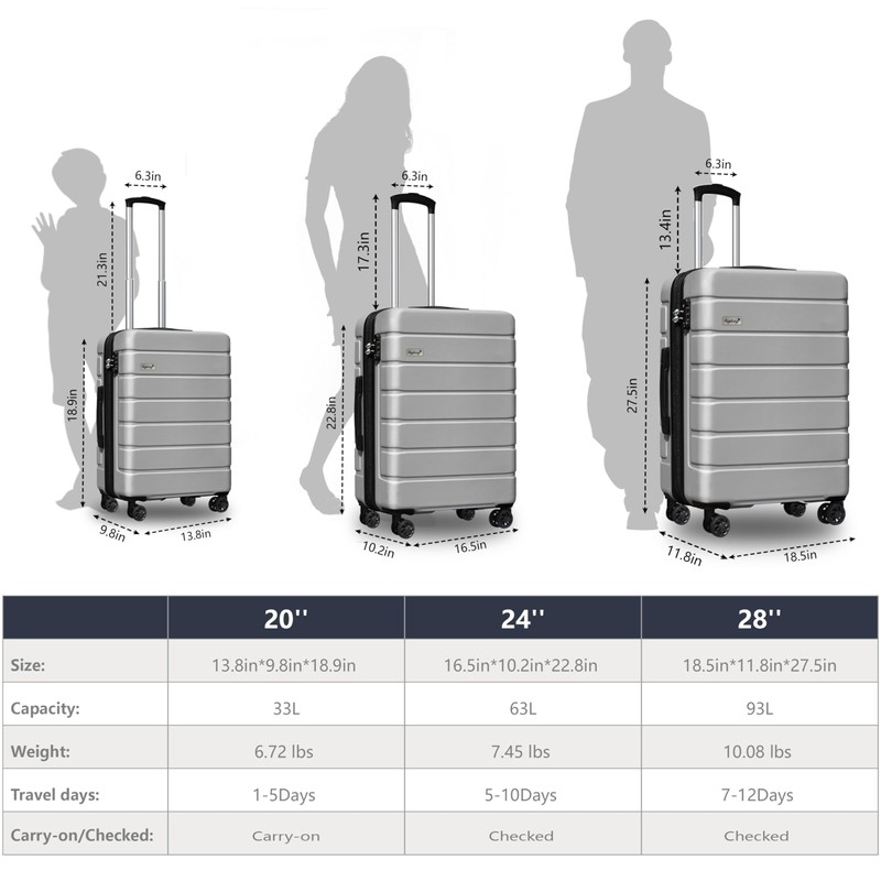 - Upgraded 3 piece luggage sets with spinner wheels include 20" carry on suitcase, 24" check in luggage, 28" large travel luggage.Stylishly designed for effortless travel.