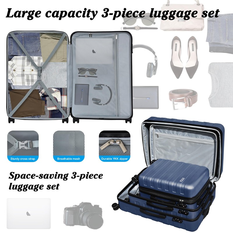 - Upgraded luggage sets include 20" carry-on luggage, 24" checked Suitcase, 28" large luggage. Stylishly designed for effortless travel.