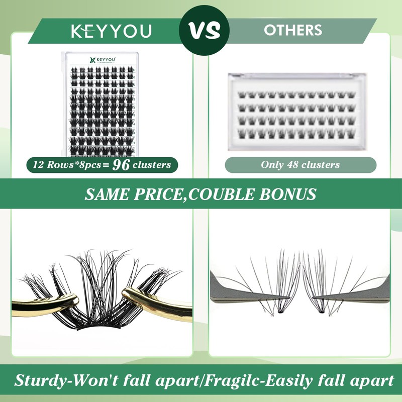 - Soft&ComfortableKEYYOU lash cluster are made of imported materials,the stem line is thinner and softer, the eyelash cluster are lighter and more comfortable to wear.96 clusters in one tray ,more cost-effective.