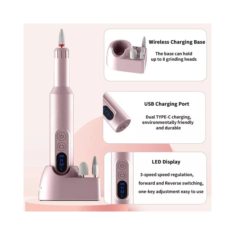 Taladro de uñas eléctrico con pantalla LED: La pantalla LED proporciona información clara y precisa, lo que permite una operación intuitiva y un uso conveniente. La lima de uñas eléctrica para uñas acrílicas es adecuada para moler, dar forma, tallar, grabar, enrutar, lijar.