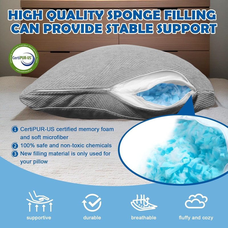 KGAUT Shredded Foam Pillow Queen Size - Cooling Memory Foam Pillows That Stay Cold Adjustable Pillows for Sleeping Double-Sided Pillowcase