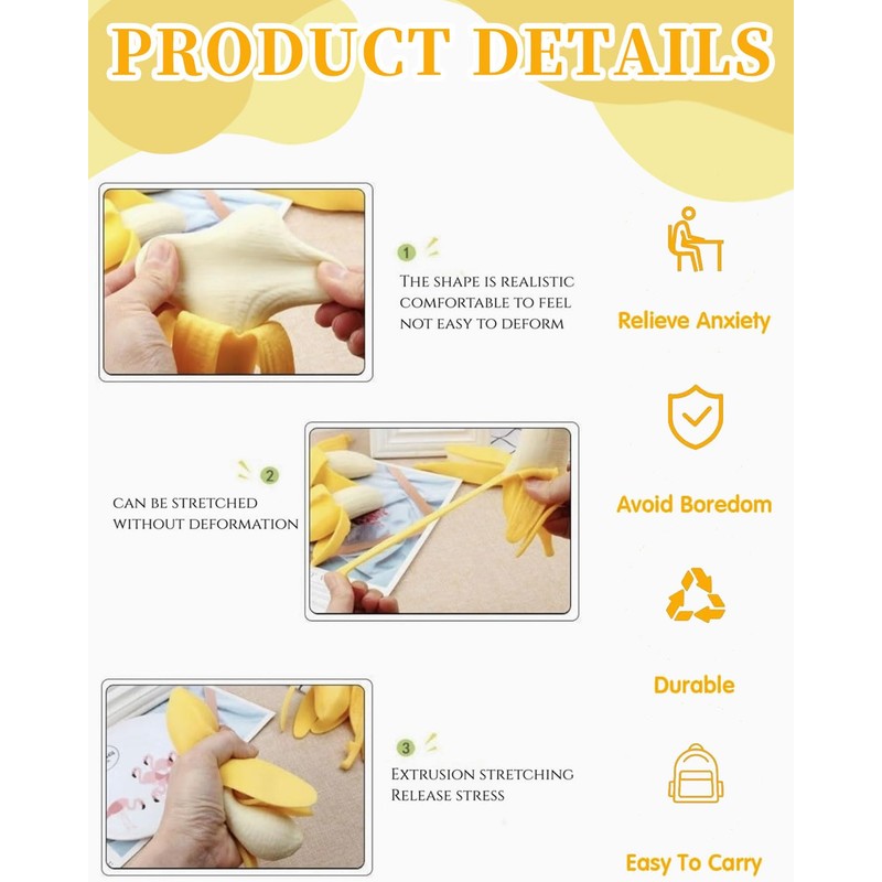 Stress relief: the banana stress toy is an excellent stress reliever. The soft and pliable texture allows you to squeeze the banana and relieve tension, which is a satisfying sensory experience.