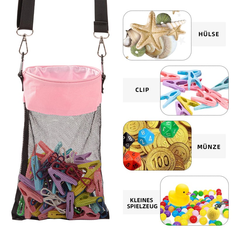- 2 solid hang carabiners – this is a great mesh bag with 3 high-quality carabiners and a shoulder strap for easy carrying. So you can leave your hands free. Portable: you can hang it on the waist or hang it outdoors on the washing line. Drawstring pocket design so you can conveniently take clothes pegs with you.