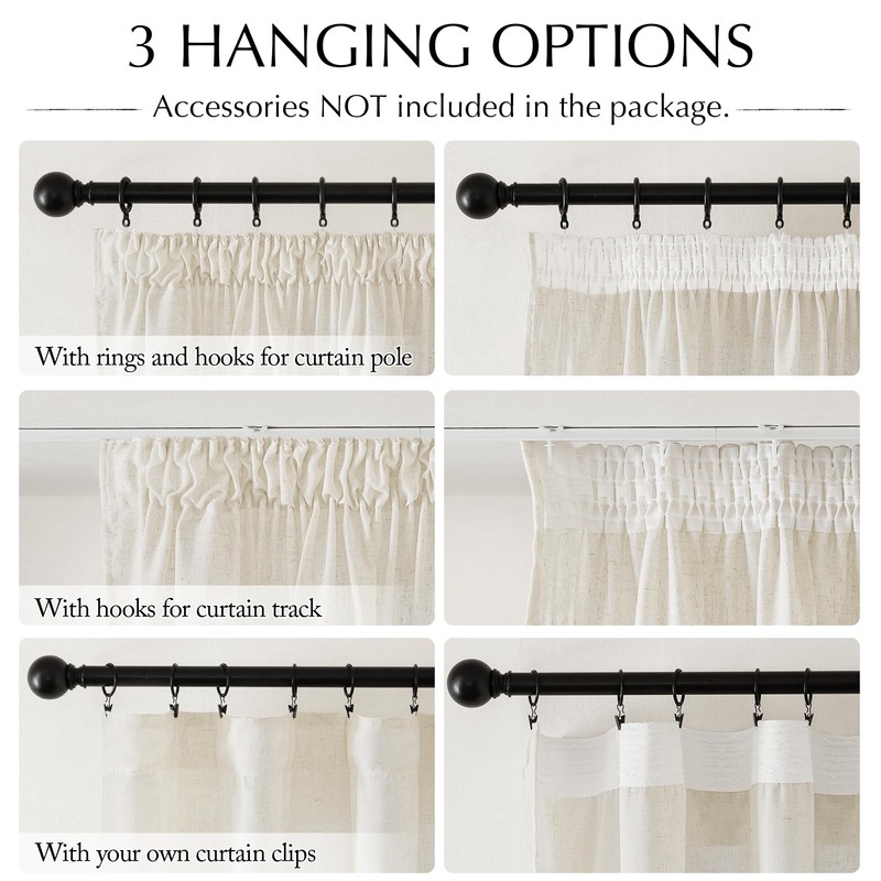 - EASY ASSEMBLY There are two methods for hanging: 1. Hang on the curtain rod with curtain rings and curtain hooks. 2. Hang on the rail with curtain rollers. (The package does not include accessories, you need to order accessories separately!)