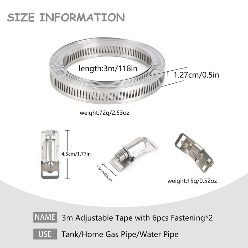 • Enough fixings: Our clamp set consists of 6 m steel tape and 12 fixings. The width of the steel band is 12.7 mm (the manual measurement may have an error of 1-2 mm).