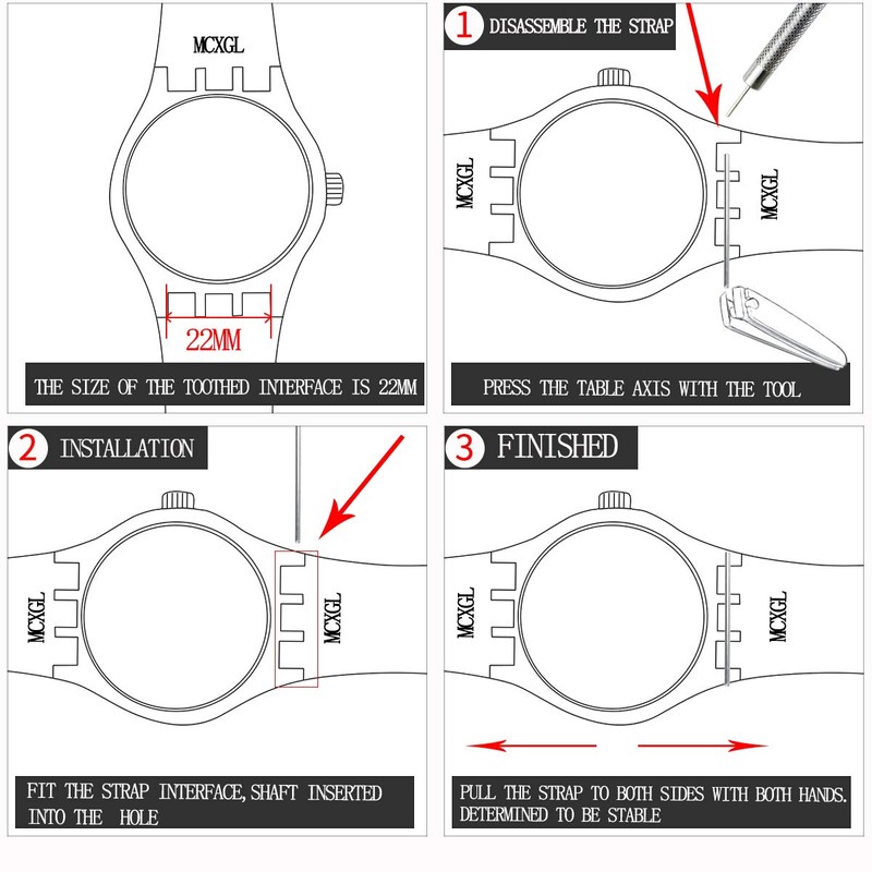 - After receiving the strap, please do not rush to install,First compare with your old strap and dial,Make sure it is appropriate before installing