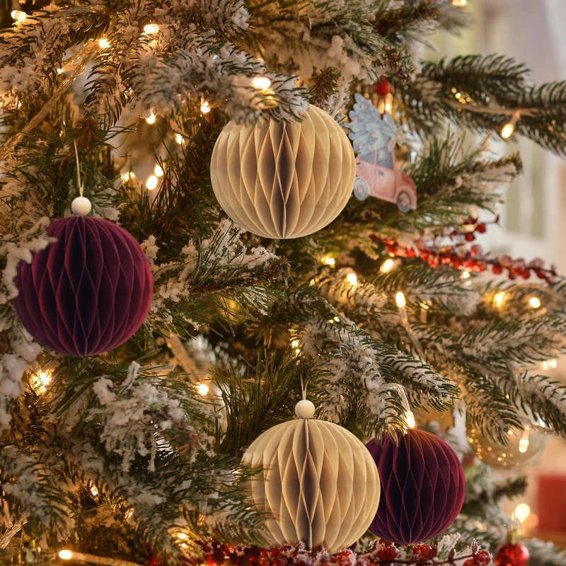 - Set of 8 Honeycomb Paper Christmas Baubles. Opened size: 8cm in diameter.