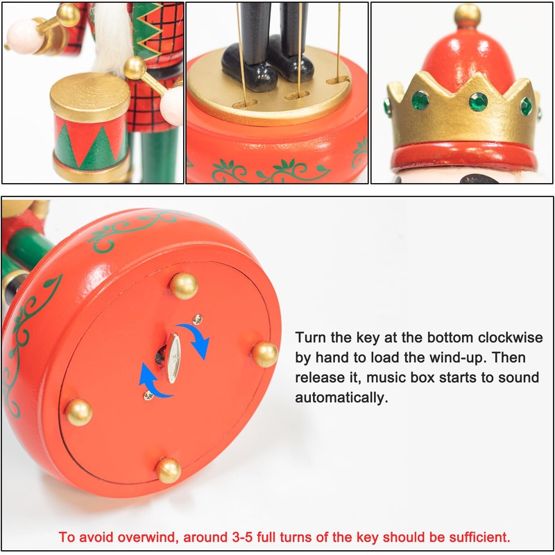- This Wooden Music Box in classic green, red, gold, and blue color. The drummer nutcracker figurine wear a red hat.