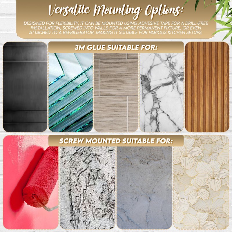 - **Versatile Mounting Options:** Designed for flexibility, it can be mounted using adhesive tape for a drill-free installation, screwed into walls for a more permanent fixture, or even attached to a refrigerator, making it suitable for various kitchen setups.