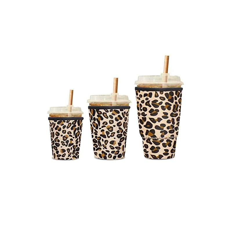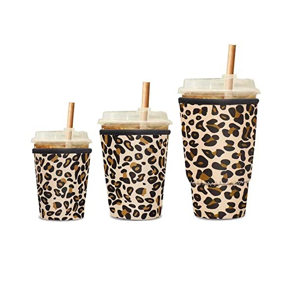 Kiatoras 3 Pack Reusable Iced Coffee Sleeve Neoprene Insulator Sleeve for Iced Coffee Cups or Cold Beverages Cups (Leopard)