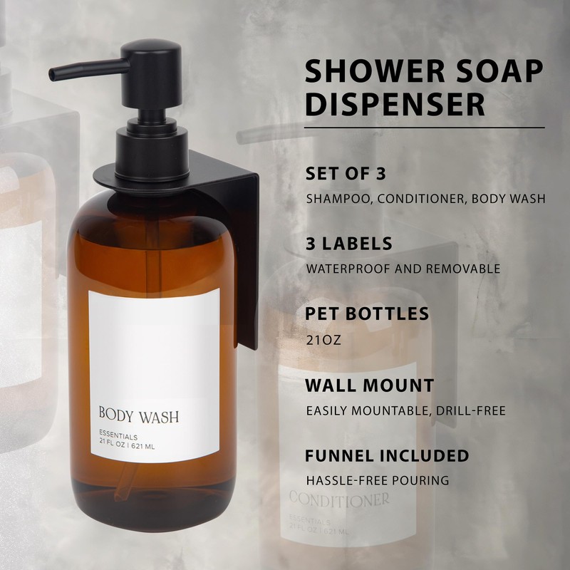 KIBAGAS Set of Shower Soap Dispenser Wall Mounted: Elevating Your Shower Experience In Style! Welcome to a new level of shower convenience and elegance! The wall-mounted shampoo and conditioner dispenser set of is designed to refresh your daily routine. Focusing on both style and practicality, the spa-inspired refillable shampoo and conditioner bottles bring a touch of glamor to your bathroom. It's not just about the decorative shower dispensers adding a feel of luxurious sophistication to your home, it's about transforming your bathroom into a clutter-free, sleek space for your ultimate well-being and soothing me-time. Seamless top-ups: fill & refill your shower accessories with ease using the handy funnel that comes with the adorable shower dispenser set - no mess, no fuss. The generously sized oz shampoo bottles with .cc pump bottle flow guarantee effortless dispensing, providing an extra layer of convenience to your daily routine. Complete set for a hassle- & drill-free installation! Say goodbye to complicated installations and unleash organized tranquility, right from the start. Simply follow the included instructions to upgrade to your tidy, organized shower space in a breeze. The shampoo dispenser for your shower comes with a metal holder kit including adhesive, rubber rings, and auxiliary stickers for a drill-free set-up. The multifunctional reusable bottles are a game-changer. Benefit from endlessly refillable shampoo, conditioner and body wash bottles with waterproof labels that can be easily removed for smart repurposing. Boasting resilient brown PET bottles, timeless black pump heads, and upscale labels, this ensemble seamlessly complements both your home and rental properties. Experience the serenity of a well-organized, clutter-free shower space with KIBAGAs set of shampoo bottles - refillable with pump.