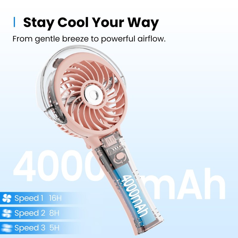KIBEE Portable Misting Fan - 4000mAh Rechargeable, 50ml Water Tank, Foldable 180° Handheld Fan with Mist Spray, 3-Speed Personal Fan, Portable Charger for Travel, Outdoors, Makeup & More(Pink)