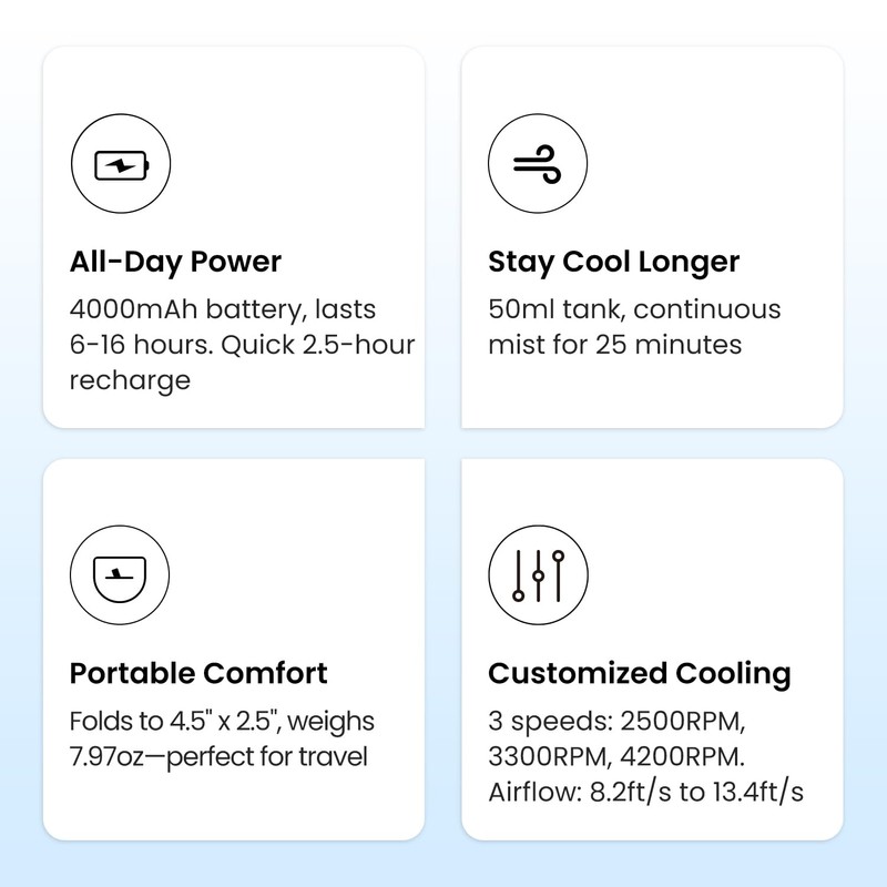 - Ready to Cool: Comes with a mist fan, 50ml water bottle, USB-C cable, neck strap, hand strap, and user manual for instant cooling.