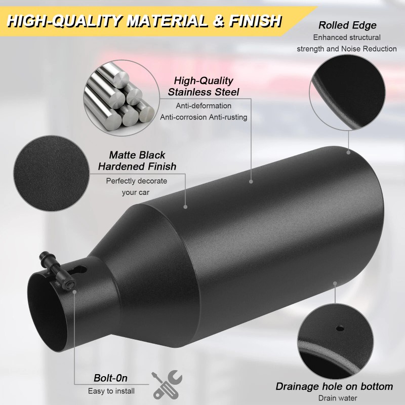 Kible Exhaust Tip 3" Inlet 6" Outlet 15" Long Bolt On Universal-Fit Powder-Coated Pipe