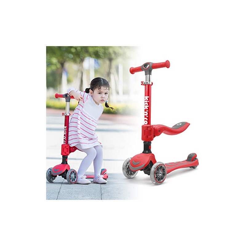 Kicknroll Scooter for Kids, 3 Light Up Wheel with Seat Toddler Scooter for Children, Extra-Wide Deck and 4-Height Adjustable Scooter for 3-12 Years Old (Red)