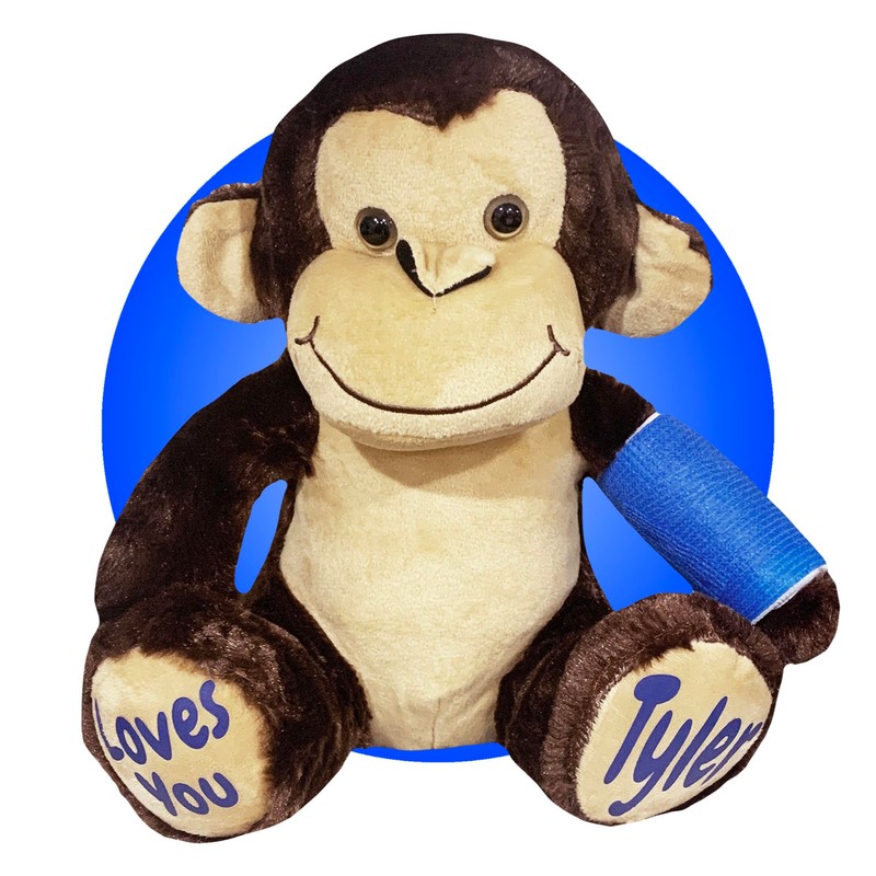 As concerned parents, we understand the importance of providing comfort and solace to our children during challenging times, especially when they are recovering from injuries. Our personalized Monkeys offer a thoughtful and delightful solution to brighten their spirits. Children often develop a special bond with toys that resemble them, and our Monkeys can be customized to feature casts on their arm, wrist, leg, or any combination thereof. Additionally, you have the option to personalize these lovable companions with your child's name and a heartfelt message on their feet. Select from a variety of font and cast colors to tailor the Monkey to your child's preferences.