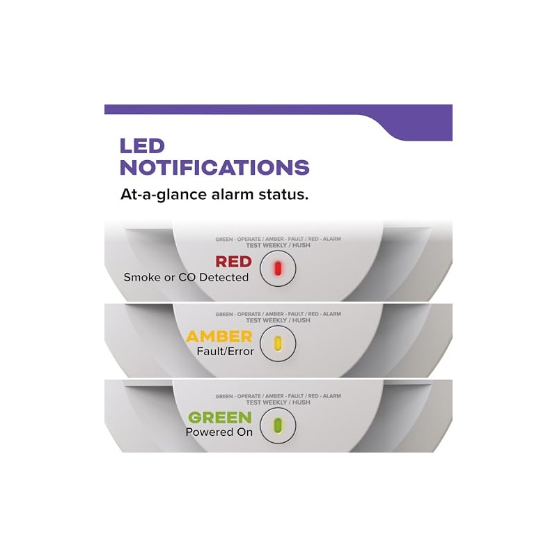 • 3 LED NOTIFICATIONS: LED lights indicate alarm status, green = normal operation, amber = operating error, red = smoke or carbon monoxide detected & a loud 85-decibel alarm will sound.