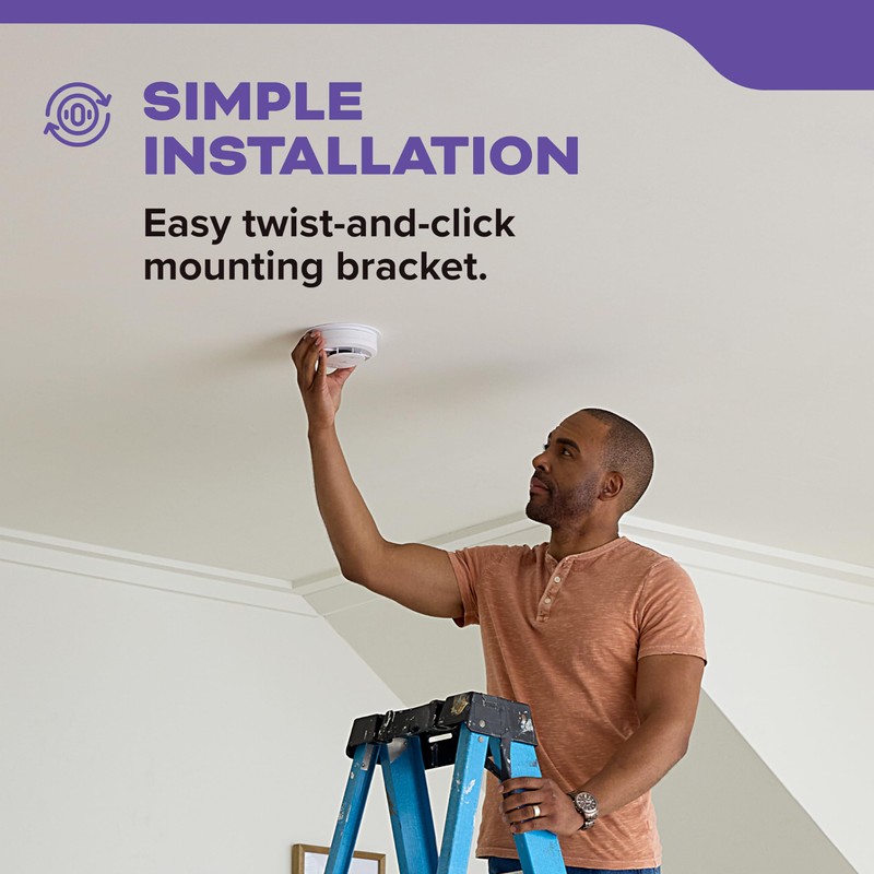 - NO WIRING NEEDED: Operates on 2-AA alkaline batteries (included) providing easy installation, simply mount the bracket onto the ceiling and twist & click the 5-inch smoke & CO alarm into the bracket.