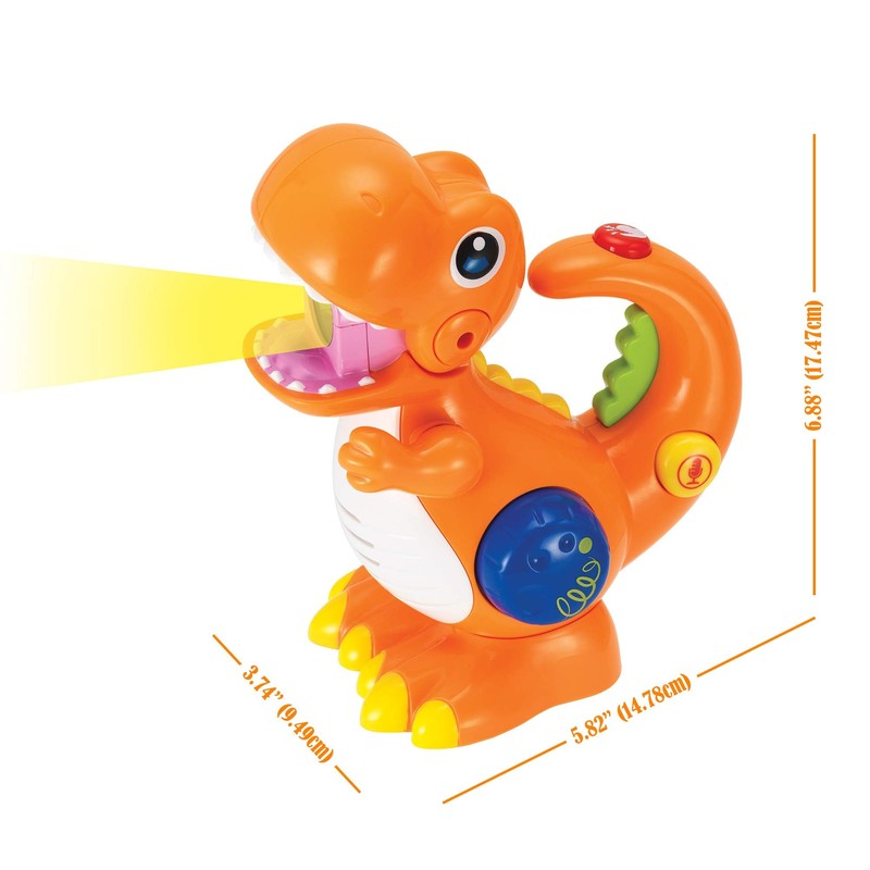 - FLASHLIGHT FOR VISUAL STIMULATION AND FUN: Press the green tail button to raise the dinosaur’s arms and open his mouth revealing a colorful light hidden inside.