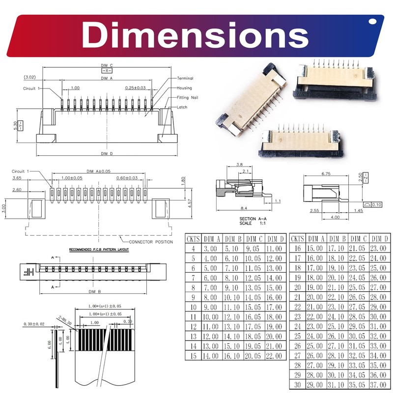 Kidisoii 1mm Flexible Flat Cable Connectors Kit, 4/6/8/10/12/14/16/18/20/24Pin FFC FPC Ribbon Sockets with 150mm Flexible Ribbon Cable Same Side (1mm-SS-Kit)
