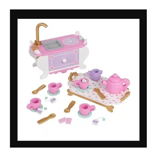 It's always a good time for a spot of tea, especially when everything is organized and ready in this compact station. The KidKraft Let's Pretend: Tea Time is perfect for tea parties with friends or stuffed animals. Brew tea with the faucet and burner, just like mom and dad. Dishware, tea bags and sugar that are sized just right for little hands are all included. And, the lid even becomes an adorable serving tray for more realistic fun! An invitation to tea has never been this much fun. The Let's Pretend: Tea Time is ideal for on-the-go make believe and fun.