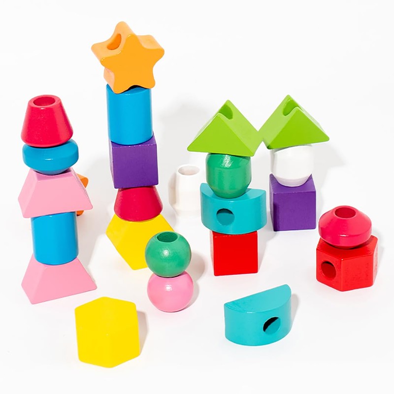 • Educational toys from 2 years old: children can thread the corresponding beads on the base by recognizing the sequence card, and also thread a string through the beads. Stack sorting by identifying blocks of different shapes and colours. The threading game from 3 years stimulates children to solve problems independently.